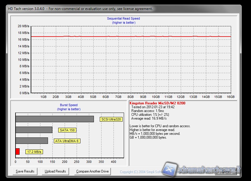 HD Tach non fa altro che confermare i risultati ottenuti con HD Tune in presenza di dati sequenziali. La SDC4/16GB fa registrare risultati di poco superiori sia in termini di velocità di trasferimento, sia per quanto riguarda gli access time, anche se le differenze sono davvero minime.